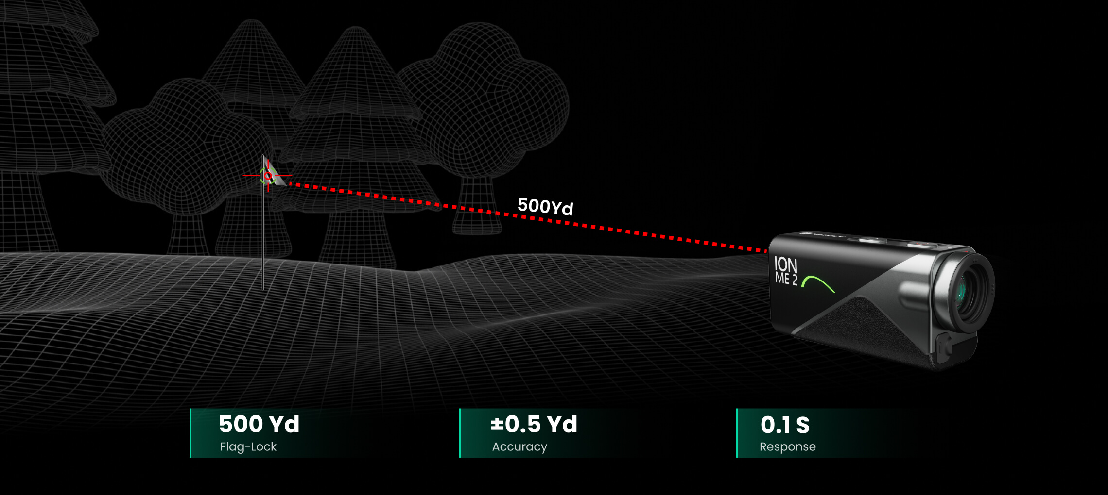 The IONME2 can measure distances up to 1,100 yards (1,000 meters) with ±0.5-yard accuracy.