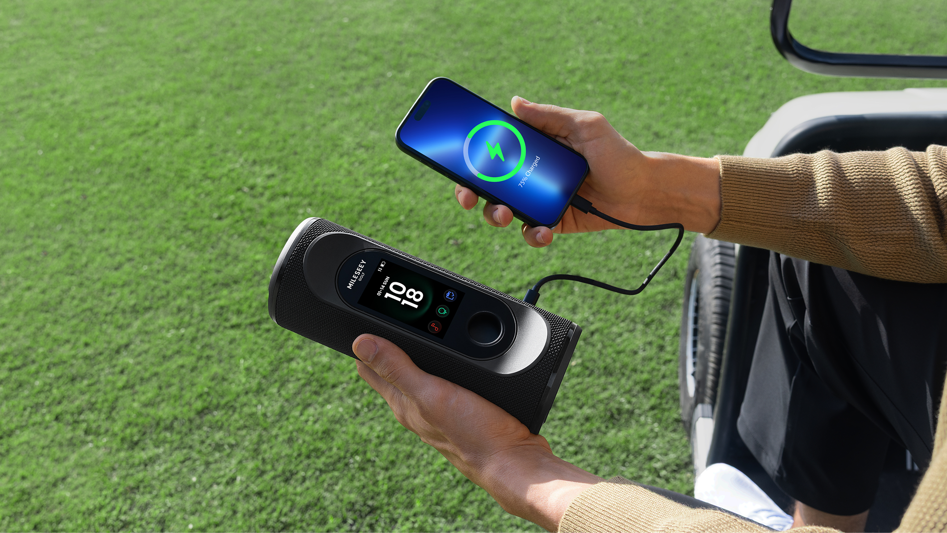 Enjoy up to 15 hours of battery life (at 50% volume), enough to power you through 3 full 18-hole rounds.